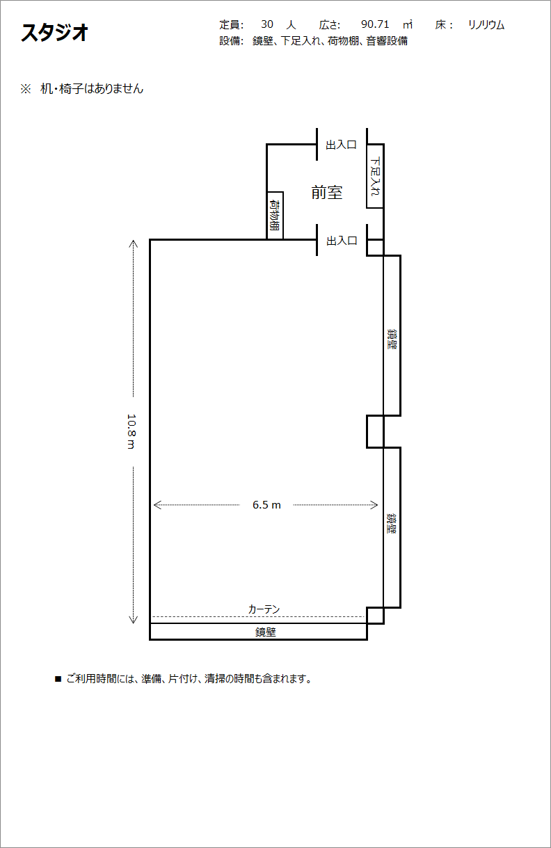 スタジオ ダンスや音楽など多彩な文化活動に対応できる、専用設備を備えたスタジオをご紹介します。 スタジオのほかにも、「大会議室全面」および「中会議室2」を、ダンスや音楽活動の場としてご利用いただけます。 スタジオ 定員30人広さ90.71㎡仕様床:リノリウム料金ご利用料金、備品使用料設備鏡壁、下足入れ、荷物棚、音響設備 レイアウト図 スタジオ 1 ファイル 255 KB ダウンロード