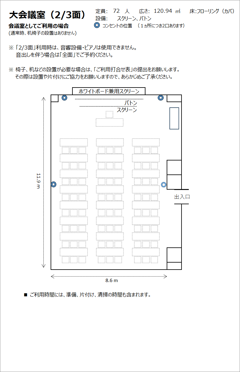 | 利用例 | ホール利用者の控室、打合せ等 |