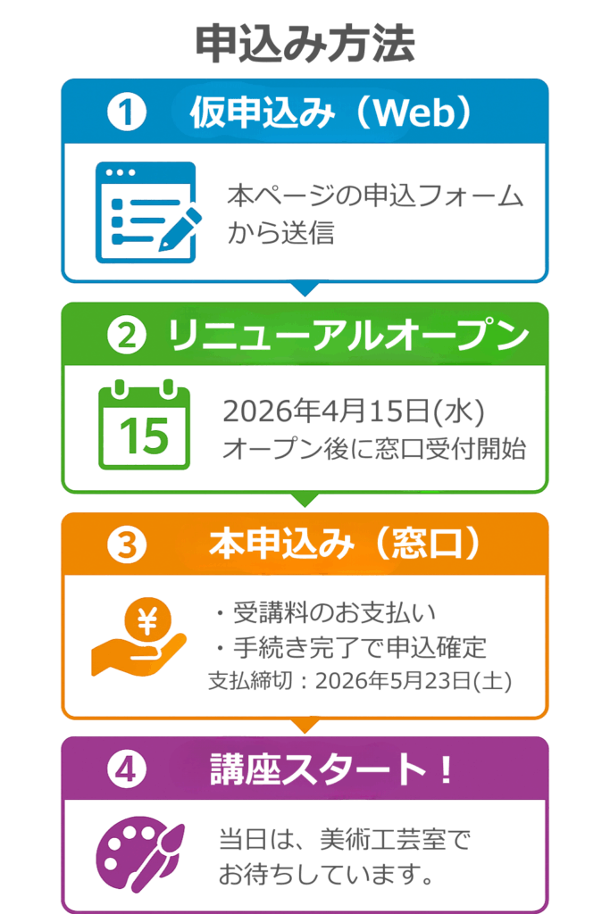 - 4月15日のリニューアルオープン以降、窓口にて本申込み(お支払い)の手続きをお願いいたします。